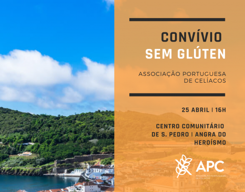 No dia 25 de abril, pelas 16h, iremos promover um momento de convívio sem glúten entre celíacos, familiares e amigos, no Centro Comunitário de S. Pedro, Angra do Heroísmo. Este evento contará também com uma sessão sobre a Doença Celíaca, Dieta Isenta de Glúten e cuidados a ter para implementação da mesma, bem como um Showcooking de pão e bolo sem glúten. É gratuito e não requer inscrição! Venha ter connosco!